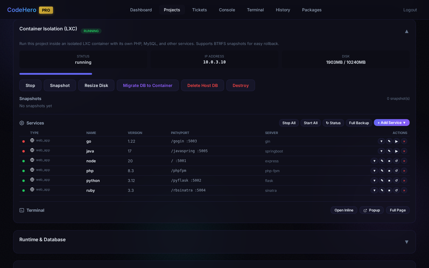 Container Isolation runs each project in its own LXC container — a lightweight virtual environment with dedicated file system, network stack, and services. Unlike shared hosting where projects compete for resources and can interfere with each other, containers provide complete isolation while using far fewer resources than traditional VMs.